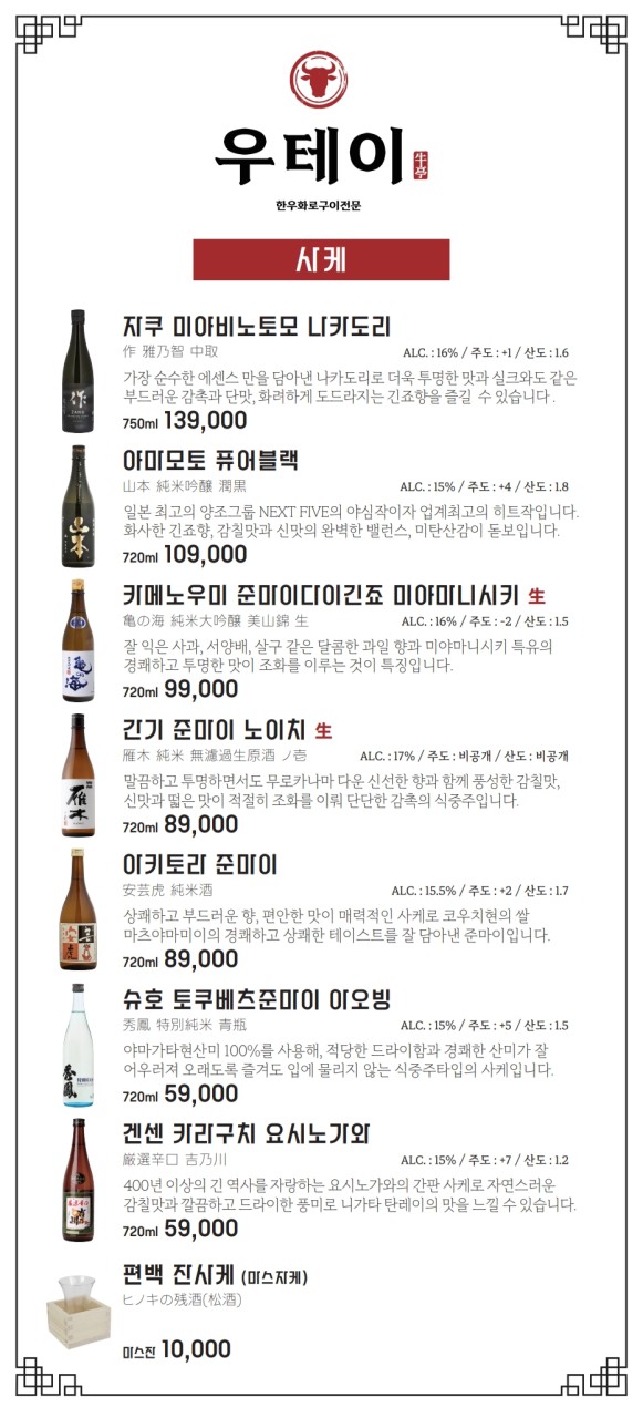 콜키지: 와인/사케 병당 1만원, 위스키 병당 3만원