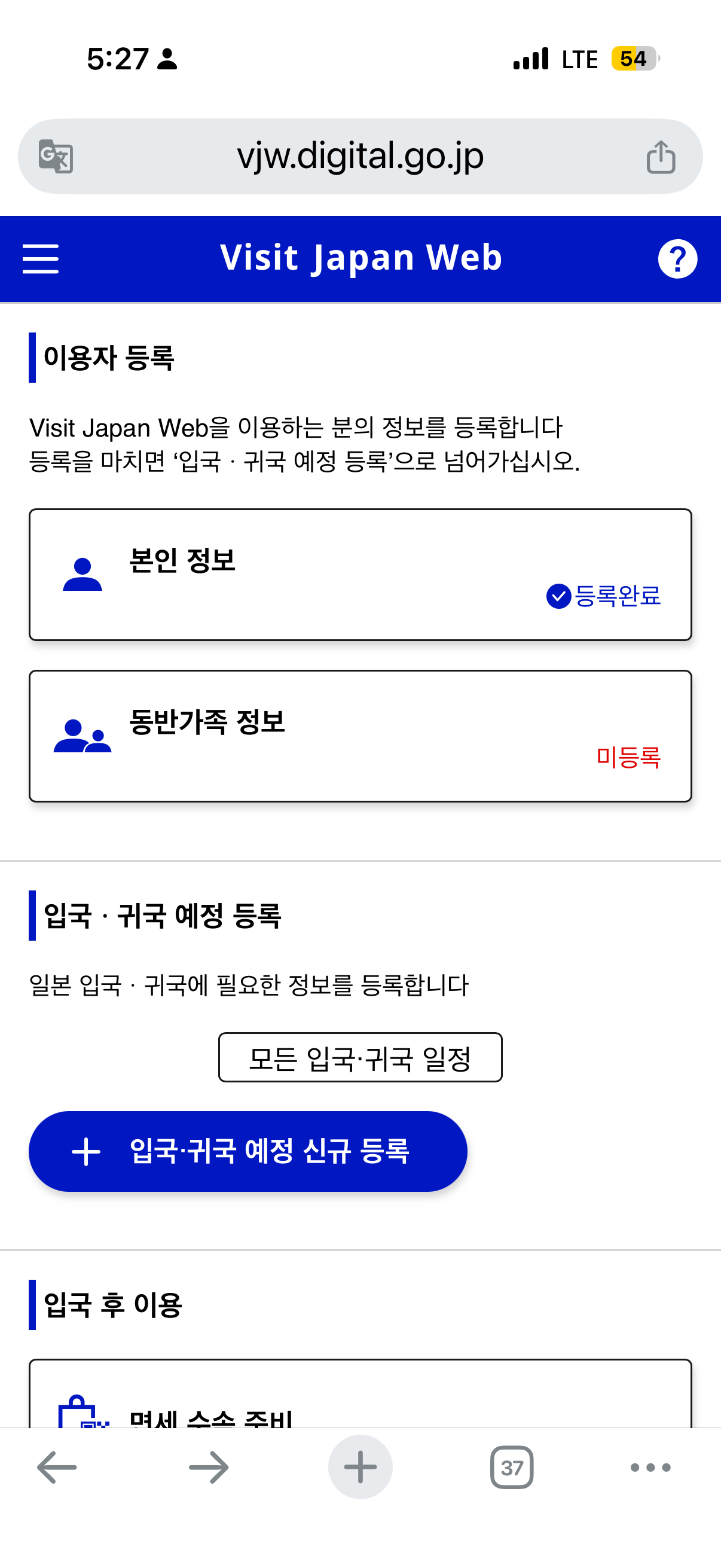 다음 단계는 입국·귀국 예정 등록이다.