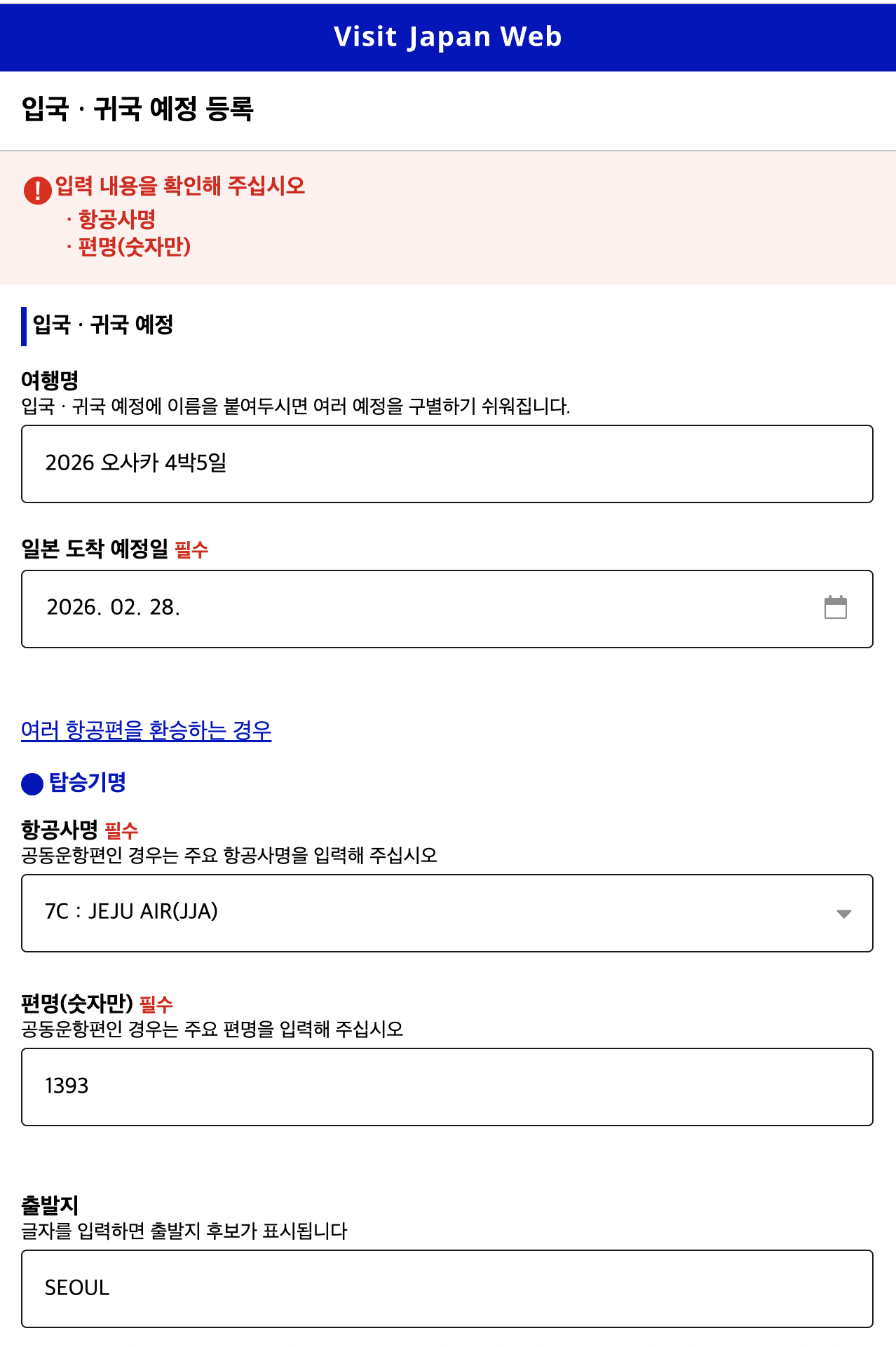 - 편명(숫자만)(필수): 7C1393 이면 → 1393만 입력