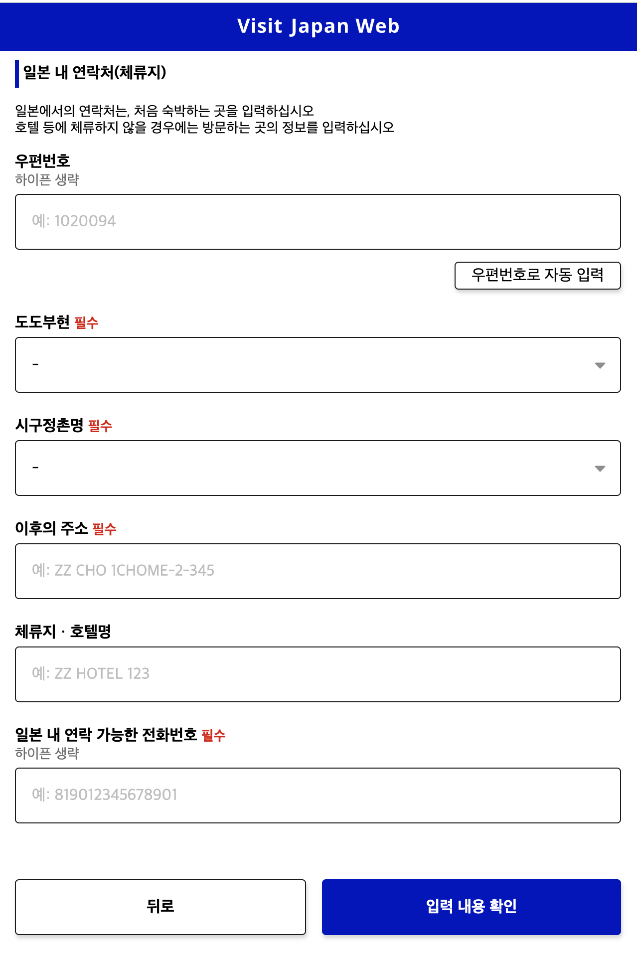 이 화면은 일본에서의 체류지(연락처)를 적는 파트다.