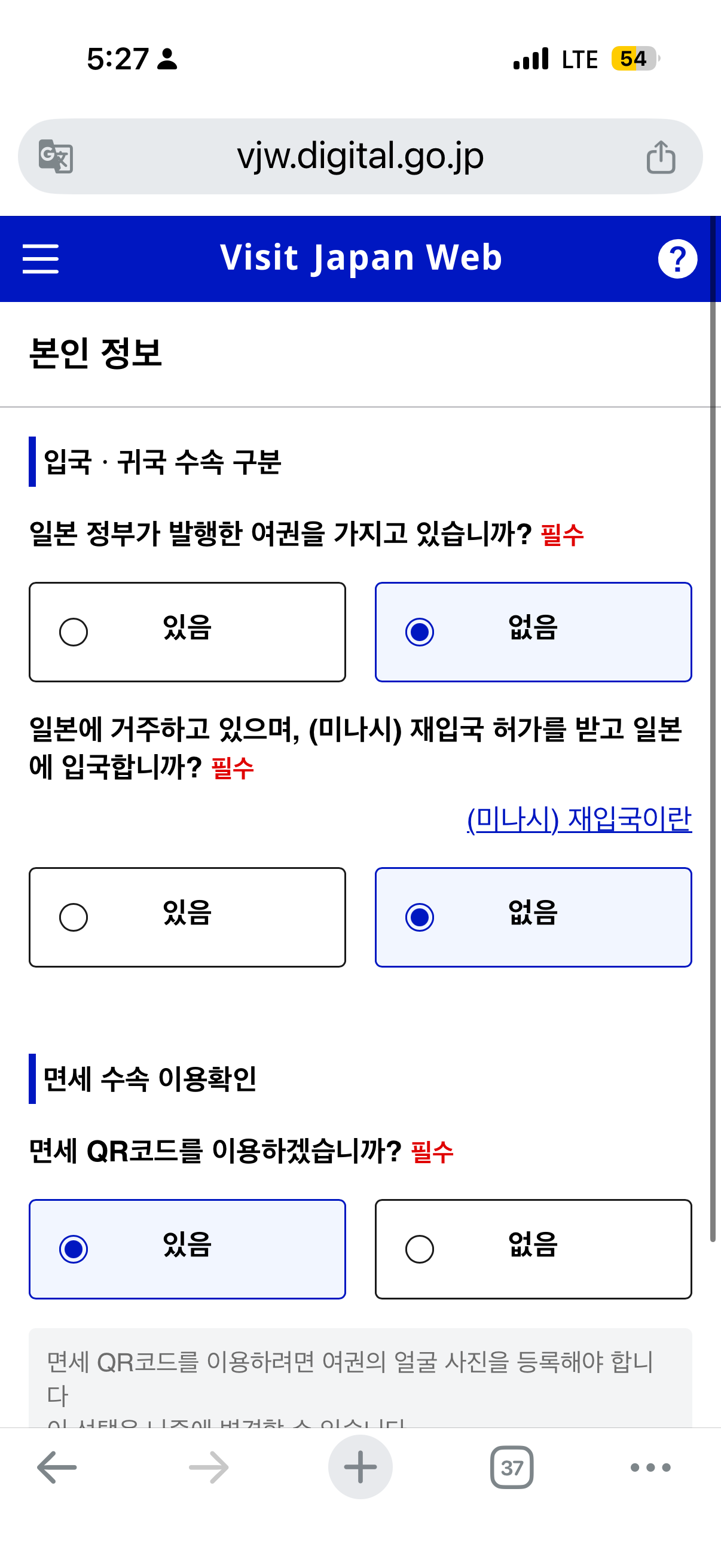 - [QR 코드 표시] → 입국심사대에서 제시